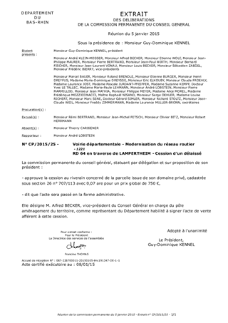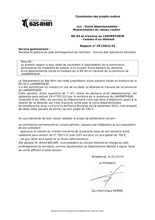 Le présent rapport a pour objet de soumettre à l'approbation de la commission permanente les modalités de cession à un riverain d'une parcelle du domaine privé départemental située en bordure de la RD 64 en traverse de la commune de LAMPERTHEIM.
