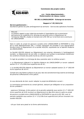 Le présent rapport a pour objet de soumettre à l'approbation de la commission permanente les modalités d'un échange de parcelles entre le Département et l'entreprise HOLCIM, situées en bordure de la RD 392 sur le territoire de la commune de LINGOLSHEIM.