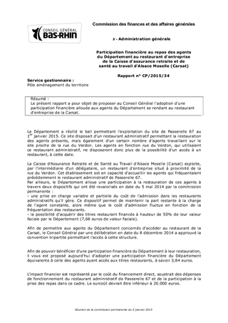 Le présent rapport a pour objet de proposer au Conseil Général l'adoption d'une participation financière allouée aux agents du Département se rendant au restaurant d'entreprise de la Carsat.