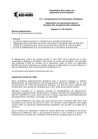Le présent rapport concerne le versement d’un acompte à l’Association Départementale d’Information et d’Action Musicales et Chorégraphiques du Bas-Rhin (ADIAM 67), nécessaire pour mener son activité dans l’attente du vote du budget primitif du Département et le renouvellement de la convention de partenariat.