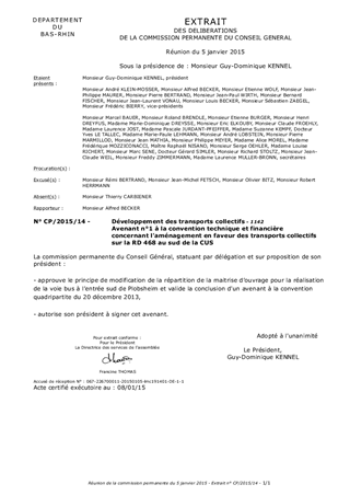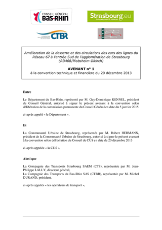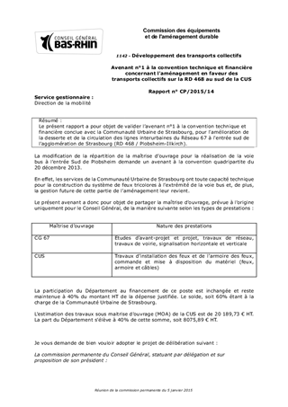 Le présent rapport a pour objet de valider l’avenant n°1 à la convention technique et financière conclue avec la Communauté Urbaine de Strasbourg, pour l'amélioration de la desserte et de la circulation des lignes interurbaines du Réseau 67 à l'entrée sud de l'agglomération de Strasbourg (RD 468 / Plobsheim-Illkirch).