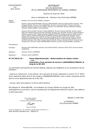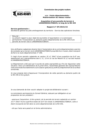 Le présent rapport a pour objet de soumettre à l'approbation e la commission permanente l’incorporation au domaine public départemental de la RD 255 d'une parcelle de terrain sise à LANGENSOULTZBACH.