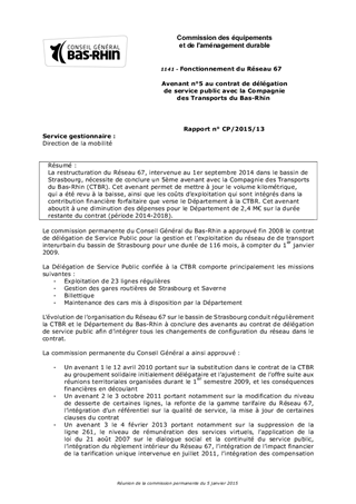 La restructuration du Réseau 67, intervenue au 1er septembre 2014 dans le bassin de Strasbourg, nécessite de conclure un 5ème avenant avec la Compagnie des Transports du Bas-Rhin (CTBR). Cet avenant permet de mettre à jour le volume kilométrique, qui a été revu à la baisse, ainsi que les coûts d’exploitation qui sont intégrés dans la contribution financière forfaitaire que verse le Département à la CTBR. Cet avenant aboutit à une diminution des dépenses pour le Département de 2,4 M€ sur la durée restante du contrat (période 2014-2018).