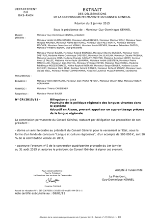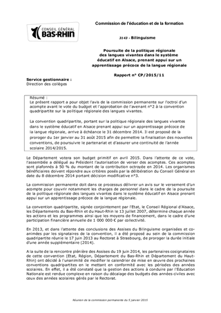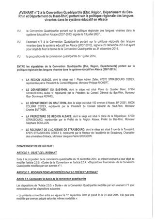 Le présent rapport a pour objet l’avis de la commission permanente sur l’octroi d’un acompte avant le vote du budget et l'approbation de l'avenant n°2 à la convention quadripartite sur la politique régionale des langues vivantes. La convention quadripartite, portant sur la politique régionale des langues vivantes dans le système éducatif en Alsace prenant appui sur un apprentissage précoce de la langue régionale, arrive à échéance le 31 décembre 2014. Il est proposé de la proroger du 1er janvier au 31 août 2015 afin de permettre la finalisation des nouvelles conventions, de poursuivre le partenariat et d’assurer une continuité de l’année scolaire 2014/2015.