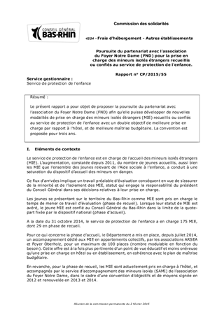Le présent rapport a pour objet de proposer la poursuite du partenariat avec l’association du Foyer Notre Dame (FND) afin qu’elle puisse développer de nouvelles modalités de prise en charge des mineurs isolés étrangers (MIE) recueillis ou confiés au service de protection de l’enfance avec un double objectif de meilleure prise en charge par rapport à l'hôtel, et de meilleure maîtrise budgétaire. La convention est proposée pour trois ans.