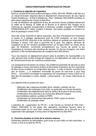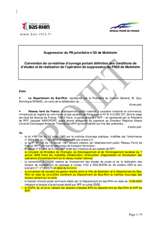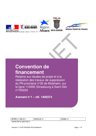 Le présent rapport concerne l’approbation : - de l'avenant n° 1 à la convention n° 700225 relative aux études de projet et à la réalisation des travaux de la dénivellation du passage à niveau N°20 à Molsheim, à passer avec la Région Alsace, RFF, la SNCF et la Ville de Molsheim, portant sur la modification de la participation de l'Etat au financement de l'opération, - de la convention de transfert de gestion du domaine communal pour les travaux routiers et l'aménagement de pistes cyclables, - de la convention d'organisation de la maîtrise d'ouvrage, - des caractéristiques techniques du projet et d'autoriser le président à demander au préfet du Bas-Rhin d'une part, de soumettre cette opération à une enquête publique ayant pour objet l'utilité publique du projet, d'autre part de soumettre ce projet à une enquête parcellaire, puis le cas échéant, à recourir à l'expropriation pour acquérir les terrains, ainsi que toutes les formalités successives.