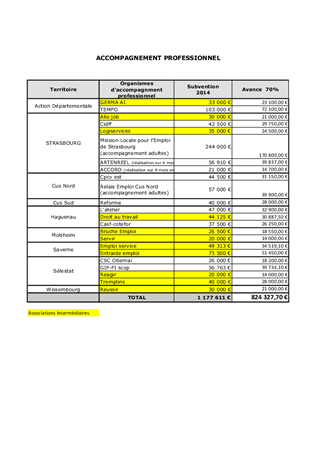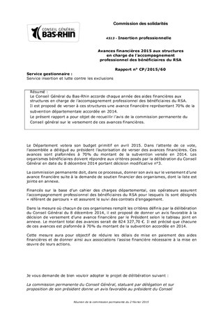 Le Conseil Général du Bas-Rhin accorde chaque année des aides financières aux structures en charge de l’accompagnement professionnel des bénéficiaires du RSA. Il est proposé de verser à ces structures une avance financière représentant 70% de la subvention départementale accordée en 2014. Le présent rapport a pour objet de recueillir l’avis de la commission permanente du Conseil général sur le versement de ces avances financières.