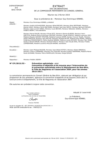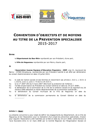 Convention d’objectifs et de moyens pour l’intervention de la prévention spécialisée entre le Département du Bas-Rhin, la Ville de Haguenau et l’association JEEP, pour les années 2015-2017.