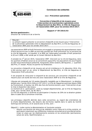 Le présent rapport présente la convention d’objectifs et de moyens pour l’intervention de la prévention spécialisée entre le Département du Bas-Rhin, la Ville de Haguenau et l’association JEEP, pour les années 2015-2017.