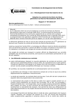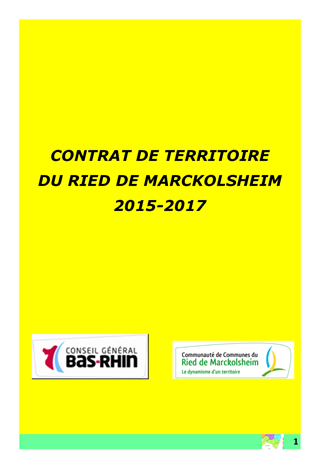 Au 31 décembre 2014 est arrivé à échéance le contrat de territoire du Ried de Marckolsheim signé pour la période 2009-2014. La communauté de communes du Ried de Marckolsheim et les communes signataires de ce contrat sont à présent susceptibles de bénéficier d'un contrat de 2ème génération pour la période 2015-2017. La programmation des opérations appelées à être financées par le Département est détaillée dans l'annexe financière jointe au rapport, en vue de votre approbation.