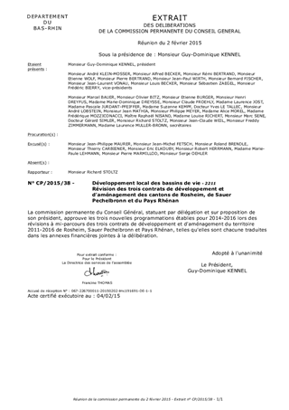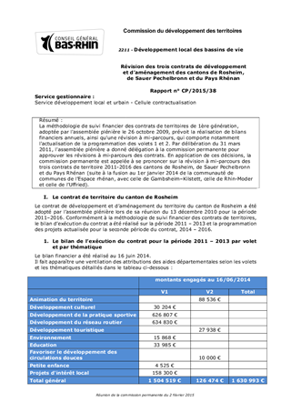 La méthodologie de suivi financier des contrats de territoires de 1ère génération, adoptée par l'assemblée plénière le 26 octobre 2009, prévoit la réalisation de bilans financiers annuels, ainsi qu'une révision à mi-parcours, qui comporte notamment l'actualisation de la programmation des volets 1 et 2. Par délibération du 31 mars 2011, l'assemblée plénière a donné délégation à la commission permanente pour approuver les révisions à mi-parcours des contrats. En application de ces décisions, la commission permanente est appelée à se prononcer sur la révision à mi-parcours des trois contrats de territoire 2011-2016 des cantons de Rosheim, de Sauer Pechelbronn et du Pays Rhénan (suite à la fusion au 1er janvier 2014 de la communauté de communes de l’Espace rhénan, avec celle de Gambsheim–Kilstett, celle de Rhin-Moder et celle de l’Uffried).
