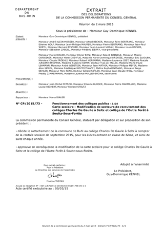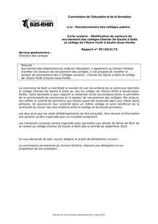 Aux termes des dispositions du code de l’éducation, il appartient au Conseil Général d’arrêter les secteurs de recrutement des collèges. Il est proposé de modifier le secteur de recrutement des 2 collèges suivants : Charles De Gaulle à Seltz et collège de l'Outre Forêt à Soultz-sous-Forêts.