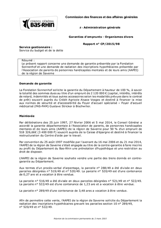 Le présent rapport concerne une demande de garantie présentée par la Fondation Sonnenhof et une demande de radiation des inscriptions hypothécaires présentée par l’Association de parents de personnes handicapées mentales et de leurs amis (AAPEI) de la région de Saverne