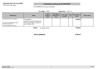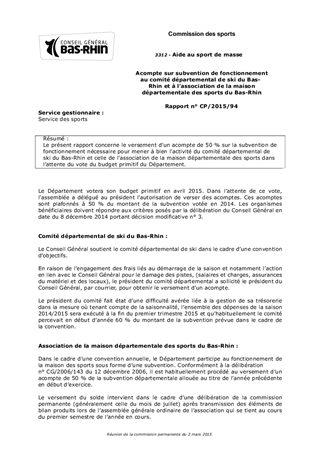 Le présent rapport concerne le versement d’un acompte de 50 % sur la subvention de fonctionnement nécessaire pour mener à bien l’activité du comité départemental de ski du Bas-Rhin et celle de l’association de la maison départementale des sports dans l’attente du vote du budget primitif du Département.