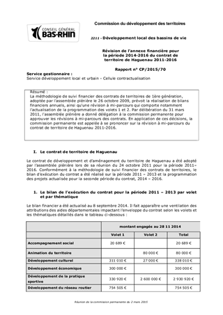 La méthodologie de suivi financier des contrats de territoires de 1ère génération, adoptée par l'assemblée plénière le 26 octobre 2009, prévoit la réalisation de bilans financiers annuels, ainsi qu'une révision à mi-parcours qui comporte notamment l'actualisation de la programmation des volets 1 et 2. Par délibération du 31 mars 2011, l'assemblée plénière a donné délégation à la commission permanente pour approuver les révisions à mi-parcours des contrats. En application de ces décisions, la commission permanente est appelée à se prononcer sur la révision à mi-parcours du contrat de territoire de Haguenau 2011-2016.