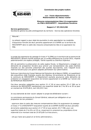 Le présent rapport a pour objet de soumettre à votre approbation les modalités d'acquisition foncière de deux parcelles appartenant à la SAFER sur le territoire de REICHSTETT dans le cadre des mesures compensatoires liées à la suppression du PN6.