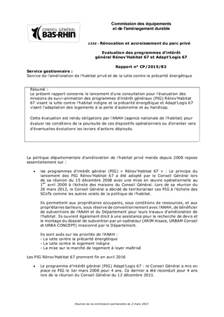 Le présent rapport concerne le lancement d'une consultation pour l'évaluation des missions de suivi-animation des programmes d'intérêt généraux (PIG) Rénov'Habitat 67 visant la lutte contre l'habitat indigne et la précarité énergétique et Adapt'Logis 67 visant l'adaptation des logements à la perte d'autonomie et au handicap. Cette évaluation est rendu obligatoire par l'ANAH (agence nationale de l'habitat) pour évaluer les conditions de la poursuite de ces dispositifs opérationnels ou d'orienter vers d'éventuelles évolutions les leviers d'actions déployés.