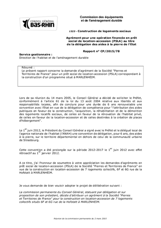Le présent rapport concerne la demande d’agrément de la Société "Pierres et Territoires de France" pour un prêt social de location-accession (PSLA) correspondant à la construction d’un programme situé à MARLENHEIM.