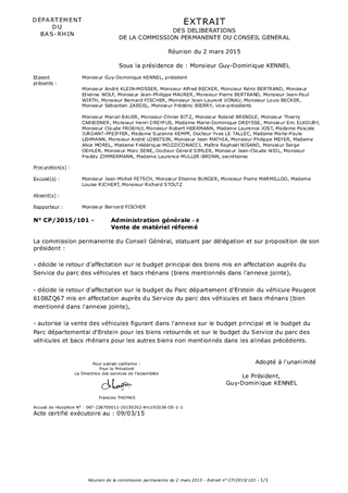 Vente de matériel réformé Resumé Le présent rapport a pour objet la vente de matériels réformés, propriété du Département du Bas-Rhin Pièces jointes Délibération Rapport Copie de Copie de Réforme 2015-1 - SPVBR.pdf Assemblée : Commission Permanente Date : 02/03/2015 Rapporteur : Monsieur Bernard FISCHER Collectivité : Conseil départemental du Bas-Rhin Direction : Direction des finances et de la commande publique Service : Service exécution et qualité comptables Domaine : Non renseigné Commission : M - Commission des finances et des affaires générales