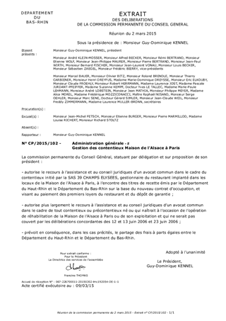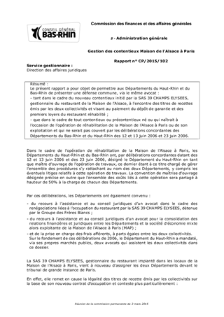 Le présent rapport a pour objet de permettre aux Départements du Haut-Rhin et du Bas-Rhin de présenter une défense commune, via le même avocat : - tant dans le cadre du nouveau contentieux initié par la SAS 39 CHAMPS ELYSEES, gestionnaire du restaurant de la Maison de l'Alsace, à l'encontre des titres de recettes émis par les deux collectivités et visant au paiement du dépôt de garantie et des premiers loyers du restaurant réhabilité ; - que dans le cadre de tout contentieux ou précontentieux né ou qui naîtrait à l’occasion de l’opération de réhabilitation de la Maison de l’Alsace à Paris ou de son exploitation et qui ne serait pas couvert par les délibérations concordantes des Départements du Bas-Rhin et du Haut-Rhin des 12 et 13 juin 2006 et 23 juin 2006.