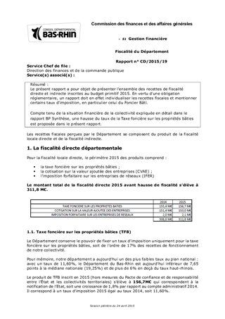 Le présent rapport a pour objet de présenter l'ensemble des recettes de fiscalité directe et indirecte inscrites au budget primitif 2015. En vertu d'une obligation réglementaire, un rapport doit en effet individualiser les recettes fiscales et mentionner certains taux d'imposition, en particulier celui du Foncier Bâti. Compte tenu de la situation financière de la collectivité expliquée en détail dans le rapport BP Synthèse, une hausse du taux de la Taxe foncière sur les propriétés bâties est proposée dans le présent rapport.