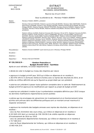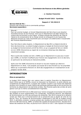 Pour son premier budget, le Conseil Départemental doit faire face à une situation d'extrême tension de ses finances. Alors que le Département est déjà l'échelon de collectivités territoriales le plus fragile, la baisse aveugle des dotations de l'Etat et l'absence de compensation de la charge sociale se conjuguent à une hausse des dépenses sociales qui reste importante pour provoquer une détérioration insoutenable des finances départementales. Pour faire face à cette situation, le Département du Bas-Rhin a d'abord cherché à faire des économies. Le présent budget propose un budget de fonctionnement égal au budget de fonctionnement primitif de 2014, ce qui a supposé de faire en réalité environ 20M€ d'économies au regard de la croissance mécanique des dépenses, notamment sociales. Mais la perte des recettes est telle (-30M€) que le Département ne peut plus investir que 118M€, un montant insuffisant pour honorer ses engagements vis-à-vis des tiers, en particulier les communes et intercommunalités. Après avoir fait 20M€ d'économies et devant la nouvelle impasse qui attend le Département en 2016, il est proposé une hausse de la taxe foncière sur les propriétés bâties qui va permettre d'honorer en 2015 des engagements en investissement et de préparer l'année 2016.