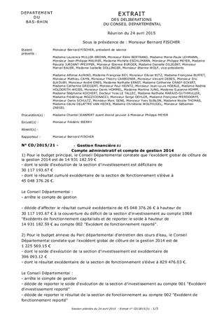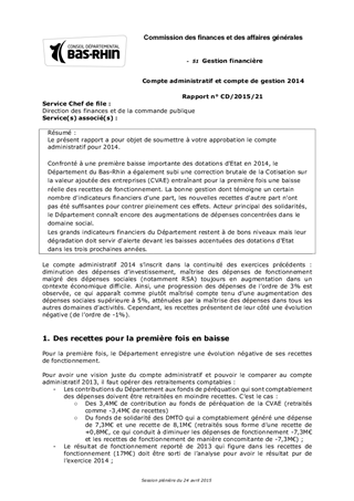 Le présent rapport a pour objet de soumettre à votre approbation le compte administratif pour 2014. Confronté à une première baisse importante des dotations d'Etat en 2014, le Département du Bas-Rhin a également subi une correction brutale de la Cotisation sur la valeur ajoutée des entreprises (CVAE) entraînant pour la première fois une baisse réelle des recettes de fonctionnement. La bonne gestion dont témoigne un certain nombre d'indicateurs financiers d'une part, les nouvelles recettes d'autre part n'ont pas été suffisantes pour contrer pleinement ces effets. Acteur principal des solidarités, le Département connaît encore des augmentations de dépenses concentrées dans le domaine social. Les grands indicateurs financiers du Département restent à de bons niveaux mais leur dégradation doit servir d'alerte devant les baisses accentuées des dotations d'Etat dans les trois prochaines années.