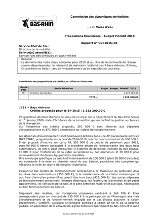 Le domaine des voies d'eau concerne pour 2015 et au titre de la continuité du réseau routier départemental, la nécessité de maintenir l'activité des 3 bacs rhénans (Rhinau, Drusenheim et Seltz), tant en investissement qu'en exploitation courante.