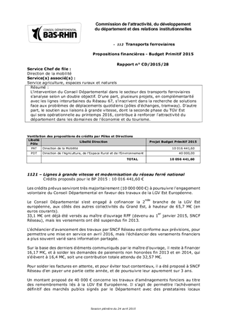 L'intervention du Conseil Départemental dans le secteur des transports ferroviaires s'analyse selon un double objectif. D'une part, plusieurs projets, en complémentarité avec les lignes interurbaines du Réseau 67, s'inscrivent dans la recherche de solutions face aux problèmes de déplacements quotidiens (pôles d'échanges, tramway). D'autre part, le soutien aux liaisons à grande vitesse, dont la seconde phase du TGV Est qui sera opérationnelle au printemps 2016, contribue à renforcer l'attractivité du département dans les domaines de l'économie et du tourisme.