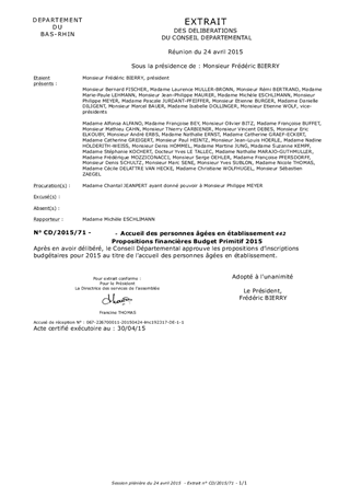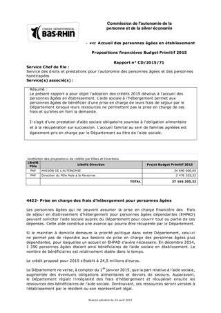 Le présent rapport a pour objet l'adoption des crédits 2015 dévolus à l'accueil des personnes âgées en établissement. L'aide sociale à l'hébergement permet aux personnes âgées de bénéficier d'une prise en charge de leurs frais de séjour par le Département lorsque leurs ressources ne permettent pas la prise en charge de ces frais et qu'elles en font la demande. Il s'agit d'une prestation d'aide sociale obligatoire soumise à l'obligation alimentaire et à la récupération sur succession. L'accueil familial au sein de familles agréées est également pris en charge par le Département au titre de l'aide sociale.