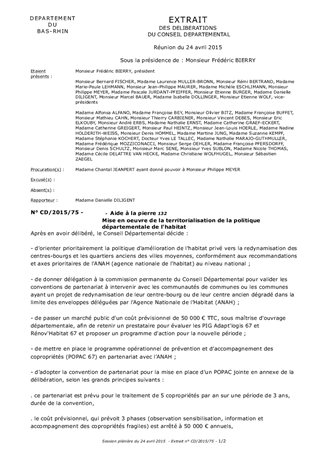 La politique départementale d’amélioration de l’habitat privé menée depuis avril 2009 repose essentiellement sur la mise en œuvre des programmes d’intérêt général (PIG) "Rénov’Habitat 67" menés à l'échelle des Schémas de Cohérence Territoriale (SCoT) et "Adapt'logis 67" mené à l'échelle départementale. Afin de mieux répondre aux objectifs de solidarité territoriale et de cohésion sociale et en cohérence avec le programme territorialisé de la politique habitat adopté par le Conseil Général le 2 mars dernier, le présent rapport propose une orientation de la politique d’amélioration de l’habitat privé ciblant la redynamisation des centres-bourgs et les quartiers anciens des villes moyennes, conformément aux recommandations et axes prioritaires de l'ANAH (agence nationale de l'habitat) au niveau national. Par ailleurs, suite à la décision du Conseil général lors de sa réunion du 2 mars dernier, il est précisé les modalités de lancement de la consultation pour l'évaluation des missions de suivi-animation des programmes d'intérêt généraux (PIG) Rénov'Habitat 67 et Adapt'Logis 67 qui prennent fin en mars 2016 pour permettre d'engager une réflexion sur la préfiguration des nouveaux programmes. Il propose également une convention de partenariat pour la mise en place d’un programme opérationnel de prévention et d’accompagnement des copropriétés (POPAC) suite à la décision du Conseil Général du 8 décembre 2014 adoptant le plan d’action pour les copropriétés.