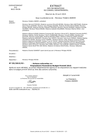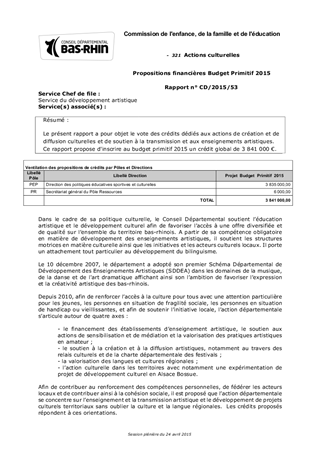 Le présent rapport a pour objet le vote des crédits dédiés aux actions de création et de diffusion culturelles et de soutien à la transmission et aux enseignements artistiques. Ce rapport propose d'inscrire au budget primitif 2015 un crédit global de 3 841 000 €.
