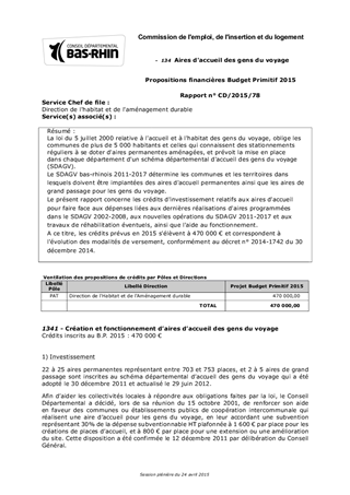 La loi du 5 juillet 2000 relative à l'accueil et à l'habitat des gens du voyage, oblige les communes de plus de 5 000 habitants et celles qui connaissent des stationnements réguliers à se doter d'aires permanentes aménagées, et prévoit la mise en place dans chaque département d'un schéma départemental d'accueil des gens du voyage (SDAGV). Le SDAGV bas-rhinois 2011-2017 détermine les communes et les territoires dans lesquels doivent être implantées des aires d'accueil permanentes ainsi que les aires de grand passage pour les gens du voyage. Le présent rapport concerne les crédits d'investissement relatifs aux aires d'accueil pour faire face aux dépenses liées aux dernières réalisations d'aires programmées dans le SDAGV 2002-2008, aux nouvelles opérations du SDAGV 2011-2017 et aux travaux de réhabilitation éventuels, ainsi que l'aide au fonctionnement. A ce titre, les crédits prévus en 2015 s'élèvent à 470 000 € et correspondent à l'évolution des modalités de versement, conformément au décret n° 2014-1742 du 30 décembre 2014.