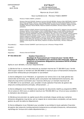 Le présent rapport retrace la situation de la dette départementale à fin 2014 et revient sur les solutions innovantes permettant au Département de poursuivre à moindre coût sa stratégie de financement, notamment à travers la souscription d'emprunts Schuldschein et d'émissions obligataires. Il propose la poursuite de la stratégie de financement actuelle fondée sur une complémentarité des sources de financement (bancaire, obligataire, placements privés). Pour cela, il soumet à l'approbation de l'Assemblée le renouvellement de la délégation au Président du Conseil départemental de la faculté de souscrire des emprunts, des lignes de trésorerie, des emprunts obligataires et des billets de trésorerie.