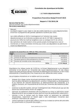 Le présent rapport a pour objet le vote des crédits destinés à la voirie départementale et de fixer le programme des grandes opérations routières pour 2015. Les crédits affectés en 2015 à l'aménagement et l'entretien des routes départementales et les itinéraires cyclables sont de 41 237 986 € traduisant la poursuite de l'effort de maîtrise budgétaire avec un pilotage très fin du rythme des opérations de modernisation et des grands projets d'aménagement, tout en maintenant un niveau d'entretien minimal pour éviter une dégradation du patrimoine routier du Département.