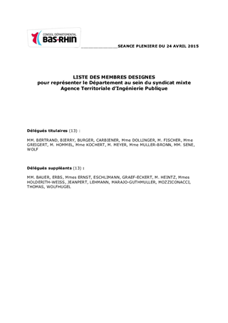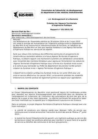 Les délibérations de l’Assemblée plénière du 20 octobre 2014 et du 2 mars 2015 ont validé le principe de mutualisation de l’ingénierie publique entre le Département du Bas-Rhin et les communes et intercommunalités du territoire, et l’adhésion du Département du Bas-Rhin en tant que membre fondateur à une Agence Territoriale d’Ingénierie Publique au service de cet objectif. Suite aux retours très nombreux des différentes communes et groupements de collectivités qui souhaitent adhérer à la future Agence Territoriale d’Ingénierie Publique, le présent rapport vise maintenant à prendre une délibération concordante avec l’ensemble des membres fondateurs pour approuver formellement les statuts de l’Agence Territoriale d’Ingénierie Publique sous la forme d’un Syndicat mixte ouvert à la carte et pour demander au Préfet de département de prendre l’arrêté portant création du Syndicat mixte « Agence Territoriale d’Ingénierie Publique ». L’objectif est la création juridique du Syndicat mixte au 1er juillet 2015 pour une mise en service effective au 1er janvier 2016. La convention précisant les modalités d’élections du Comité syndical est également jointe à ce rapport pour approbation.