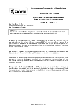Ce rapport a pour objet la désignation des représentants du Conseil Départemental dans divers organismes à caractère réglementaire, associatif ou autres.