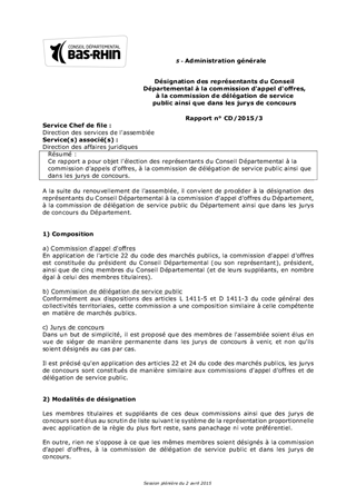 Ce rapport a pour objet l'élection des représentants du Conseil Départemental à la commission d'appels d'offres, à la commission de délégation de service public ainsi que dans les jurys de concours.