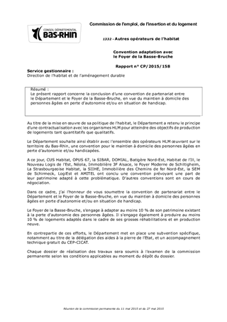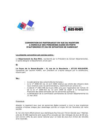 Le présent rapport concerne la conclusion d’une convention de partenariat entre le Département et le Foyer de la Basse-Bruche, en vue du maintien à domicile des personnes âgées en perte d’autonomie et/ou en situation de handicap.