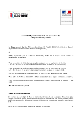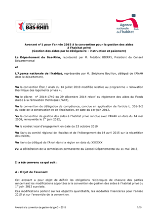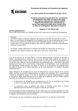 Le présent rapport concerne l'adoption des premiers avenants annuels 2015, d'une part, à la convention de délégation de compétence de six ans en application de l'article L.301-5-2 du code de la construction et de l'habitation signée le 1er juin 2012 et d'autre part, à la convention de gestion des aides de l'ANAH à l'habitat privé également signée le 1er juin 2012. Ce rapport indique également le montant des forfaits de subvention au titre de la délégation des aides à la pierre de l'Etat (parc HLM) pour l'année 2015.