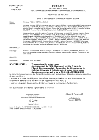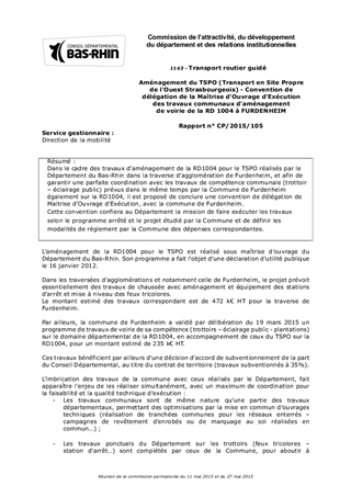 Dans le cadre des travaux d’aménagement de la RD1004 pour le TSPO réalisés par le Département du Bas-Rhin dans la traverse d’agglomération de Furdenheim, et afin de garantir une parfaite coordination avec les travaux de compétence communale (trottoir – éclairage public) prévus dans le même temps par la Commune de Furdenheim également sur la RD1004, il est proposé de conclure une convention de délégation de Maitrise d’Ouvrage d’Exécution, avec la commune de Furdenheim. Cette convention confiera au Département la mission de faire exécuter les travaux selon le programme arrêté et le projet étudié par la Commune et de définir les modalités de règlement par la Commune des dépenses correspondantes.