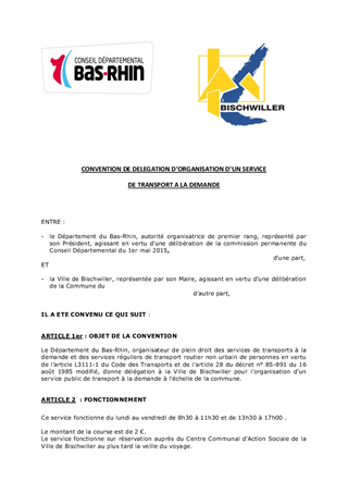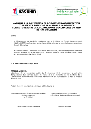 Avenant à la convention de délégation de compétence pour le transport à la demande de la communauté de communes du Ried de Marckolsheim et convention de délégation d'organisation d'un transport à la demande avec la Ville de Bischwiller.