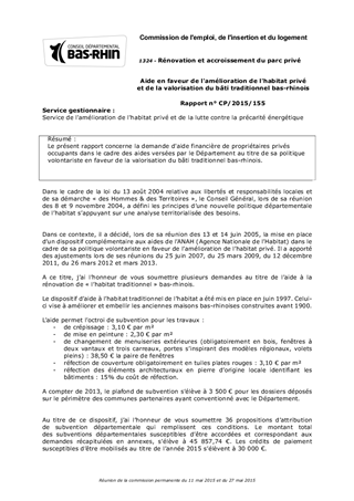 Le présent rapport concerne la demande d'aide financière de propriétaires privés occupants dans le cadre des aides versées par le Département au titre de sa politique volontariste en faveur de la valorisation du bâti traditionnel bas-rhinois.