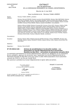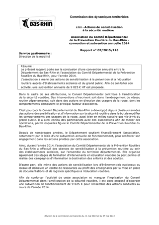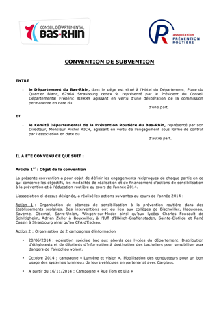 Le présent rapport porte sur la conclusion d'une convention annuelle entre le Département du Bas-Rhin et l'association du Comité Départemental de la Prévention Routière du Bas-Rhin, pour l'année 2014. L'association a mené des actions de sensibilisation à la prévention et à l'éducation routière auprès d'établissements scolaires et du grand public. Afin de conforter son activité, une subvention annuelle de 9 025 € HT est proposée.