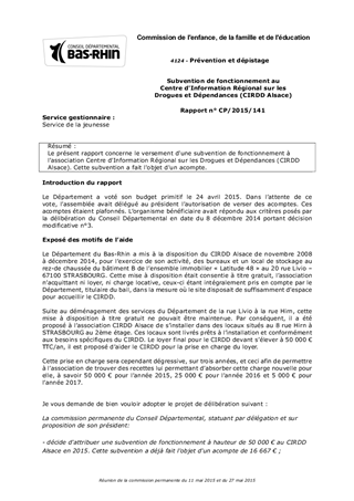 Le présent rapport concerne le versement d'une subvention de fonctionnement à l'association Centre d'Information Régional sur les Drogues et Dépendances (CIRDD Alsace). Cette subvention a fait l'objet d'un acompte.