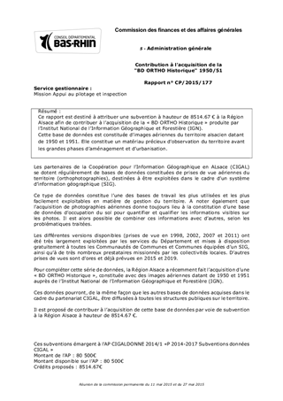 Ce rapport est destiné à attribuer une subvention à hauteur de 8514.67 € à la Région Alsace afin de contribuer à l’acquisition de la « BD ORTHO Historique » produite par l’Institut National de l’Information Géographique et Forestière (IGN). Cette base de données est constituée d’images aériennes du territoire alsacien datant de 1950 et 1951. Elle constitue un matériau précieux d’observation du territoire avant les grandes phases d’aménagement et d’urbanisation.