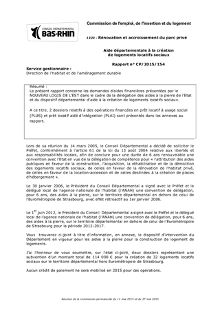 Le présent rapport concerne les demandes d’aides financières présentées par le NOUVEAU LOGIS DE L’EST dans le cadre de la délégation des aides à la pierre de l’Etat et du dispositif départemental d’aide à la création de logements locatifs sociaux. A ce titre, 2 dossiers relatifs à des opérations financées en prêt locatif à usage social (PLUS) et prêt locatif aidé d’intégration (PLAI) sont présentés dans les annexes au rapport.