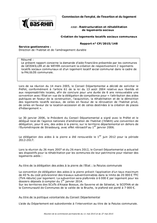 Le présent rapport concerne la demande d’aide financière présentée par les communes de GEISWILLER et de WEYER concernant la création de respectivement 2 logements locatifs sociaux communaux et d’un logement locatif social communal dans le cadre de la PALULOS communale.