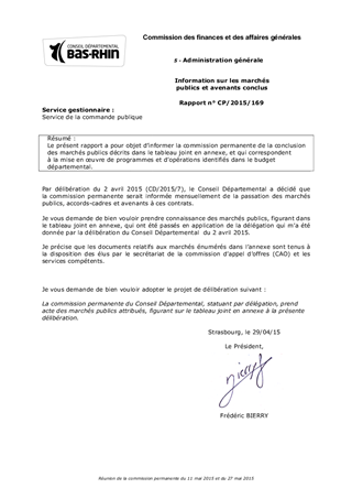 Le présent rapport a pour objet d’informer la commission permanente de la conclusion des marchés publics décrits dans le tableau joint en annexe, et qui correspondent à la mise en œuvre de programmes et d’opérations identifiés dans le budget départemental.