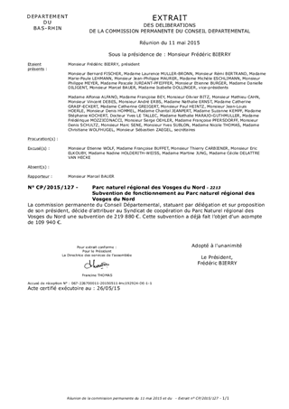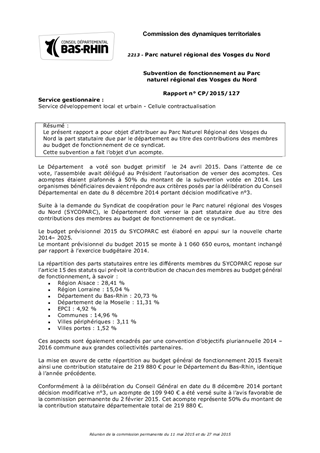 Le présent rapport a pour objet d'attribuer au Parc Naturel Régional des Vosges du Nord la part statutaire due par le département au titre des contributions des membres au budget de fonctionnement de ce syndicat. Cette subvention a fait l’objet d’un acompte.